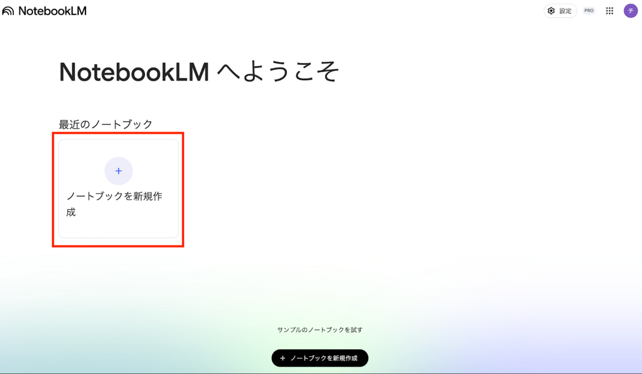 mNotebookLMの画面。「NotebookLMを試す」をクリック 次に「ノートブックを新規作成」して、英語ニュースを入れていこうと思います。