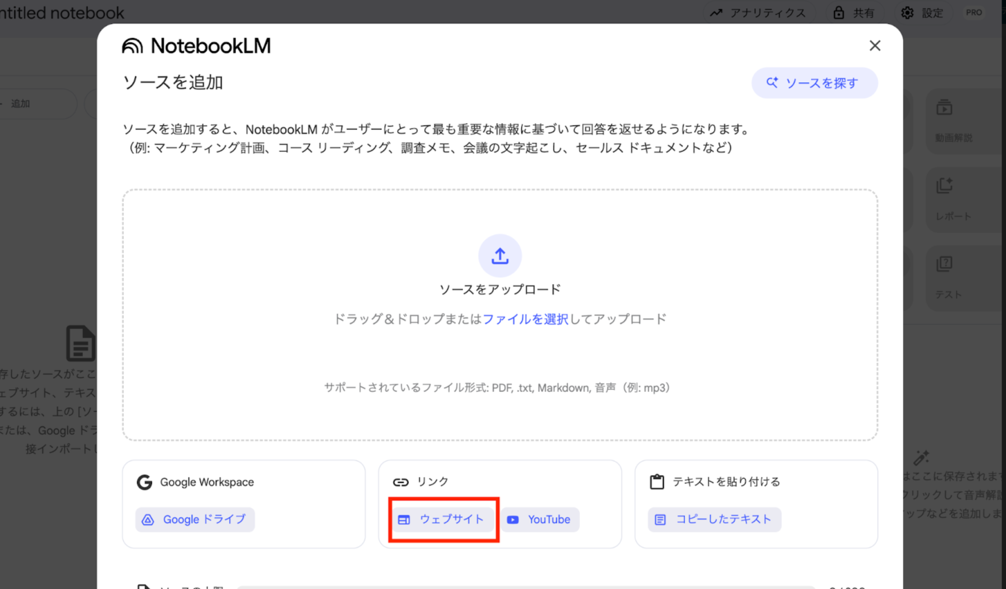 「ノートブックを新規作成」をクリックして進む ソースを追加できる画面に移行しました。ファイル、Googleドライブ、ウェブサイトリンク、Youtubeリンク、テキストの直貼りのいずれかでソースが追加できるようです。今回はウェブサイトリンクで追加しようと思いますが、紙の新聞記事の写真などでもアップロードできるため便利だと感じました。