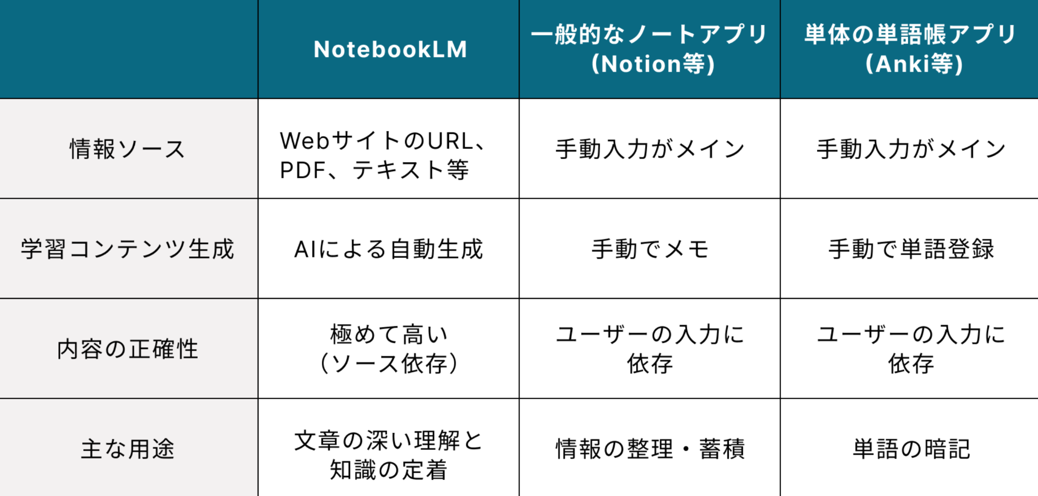 既存の単語帳アプリが、予め用意された単語を覚えるための「ドリル」だとすれば、NotebookLMは、自分が今読んでいる“生きた教材”を、瞬時にパーソナライズされた「ドリル」に変換してくれるエンジンと言えるでしょう。