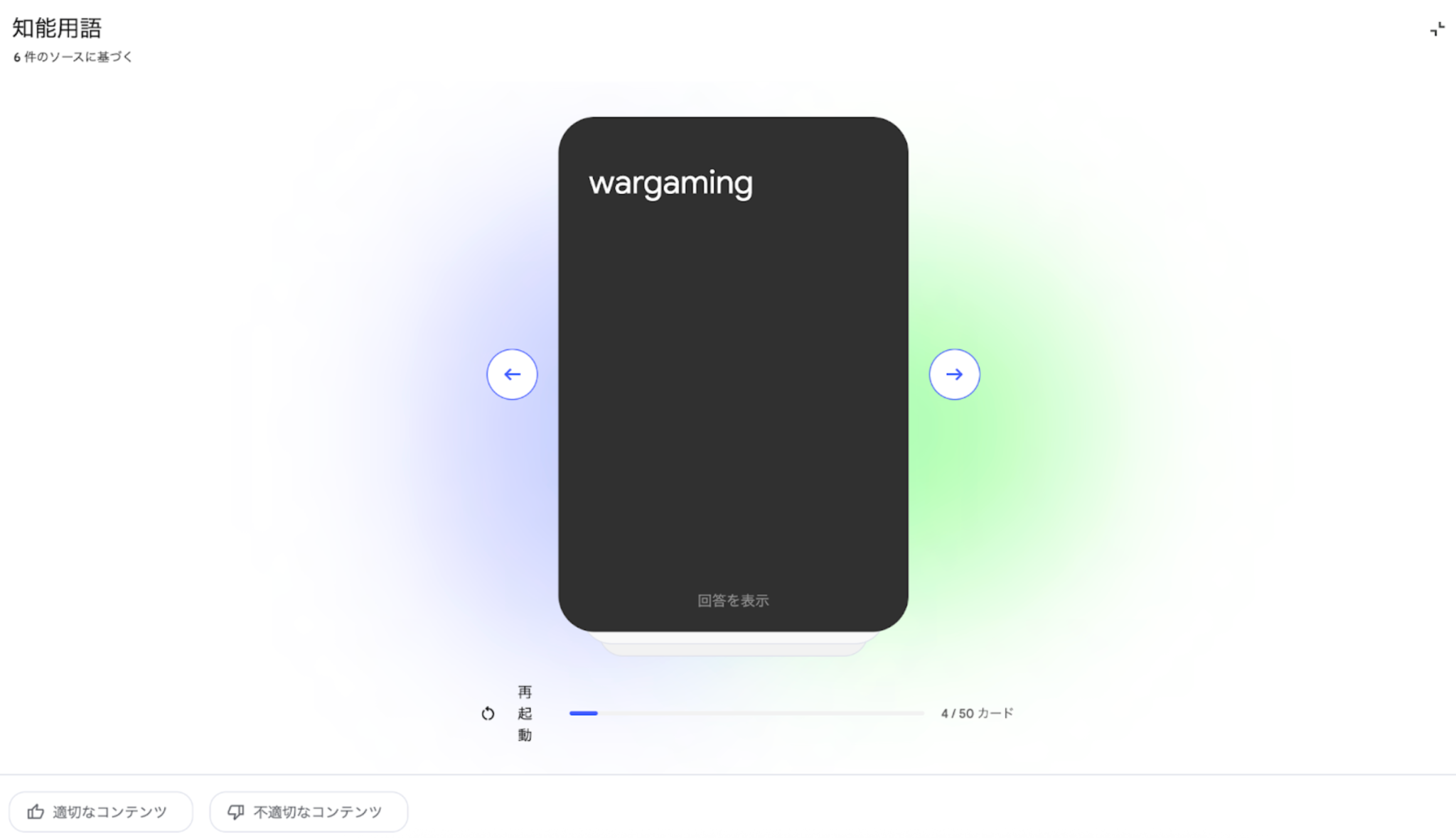 生成されたフラッシュカードセット「知覚用語」 それでは、実際にフラッシュカードの中身をみていきます。全部で50枚分作成されました。画像にある「wargaming」と「pivoting」のように、一般的な意味とあわせて読み込んだ記事内での意味も入っていてわかりやすいです。また、Space キーで裏返し、「← / →」キーで移動できるのもサクサク進められてユーザー的にありがたいと感じました。
