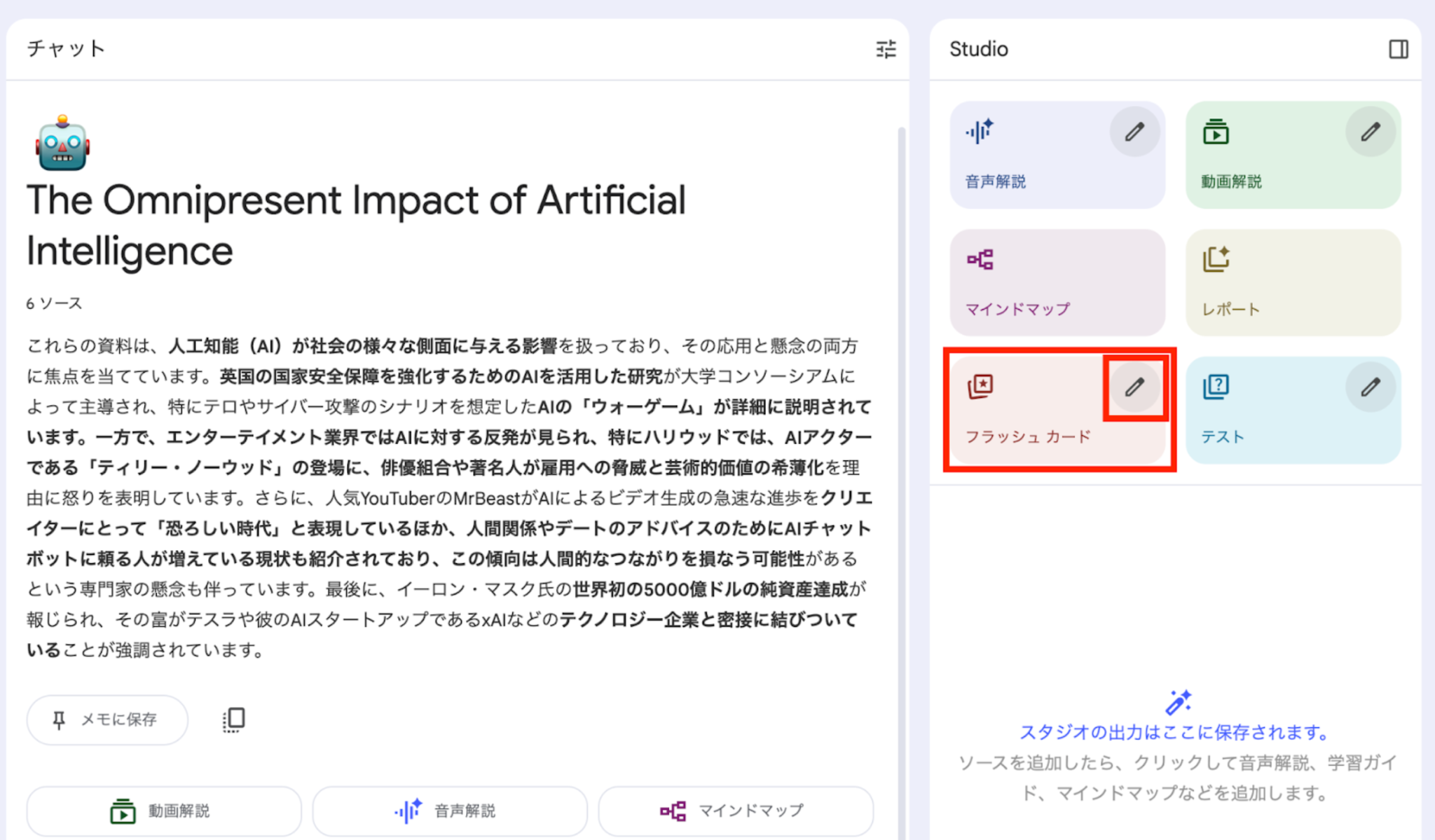 ワンポイント:音声概要とのハイブリッド学習 暗記の仕上げには、NotebookLMの**「音声概要(Audio Overview)」**を組み合わせるのがおすすめです。フラッシュカードで視覚的に覚えた内容を、AIが生成する「ポッドキャスト風の会話」として耳から取り入れます。日本語でも生成可能なため、移動中に聴き流すだけで、カードで学習した断片的な知識がストーリーとして繋がり、より深い記憶へと変わっていきます。