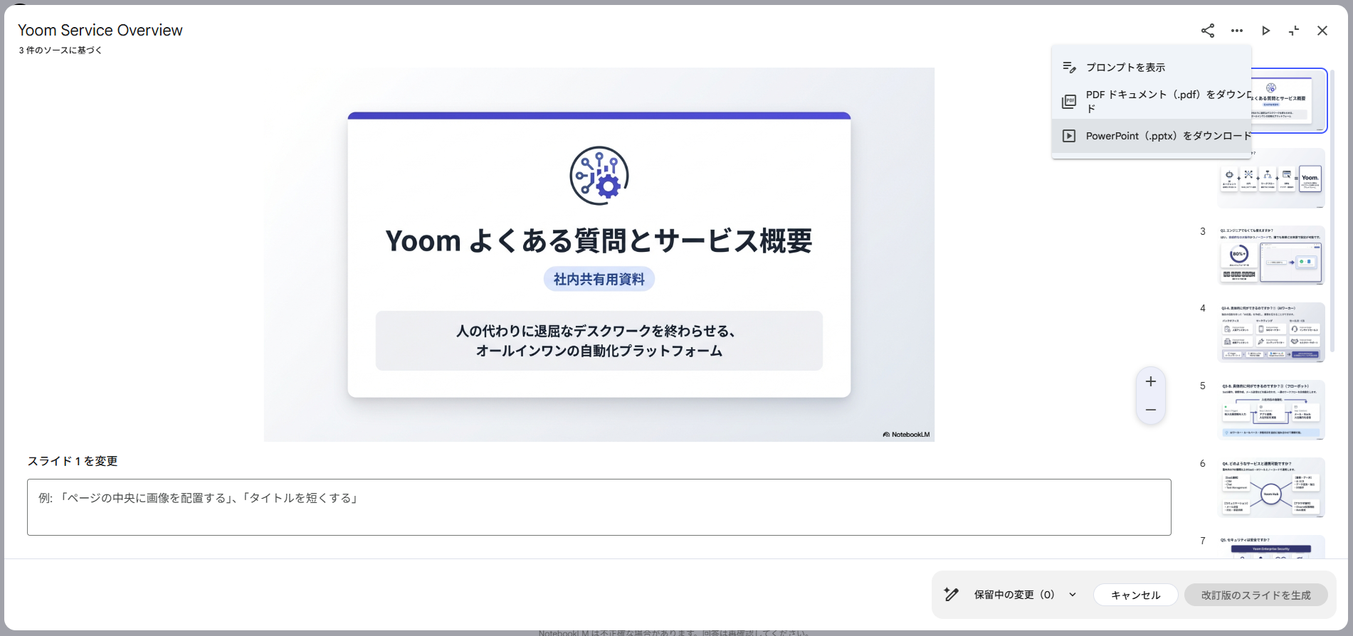上記のようなプロンプトを設定し、作成ボタンをクリックすると、数分でこれらのスライドが作成されました。