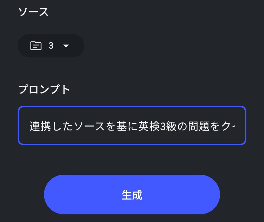 まずはクイズ機能ですが、プロンプトに「連携したソースをもとに英検3級の問題をクイズとして作成してほしい」 と入力し作成を行いました。