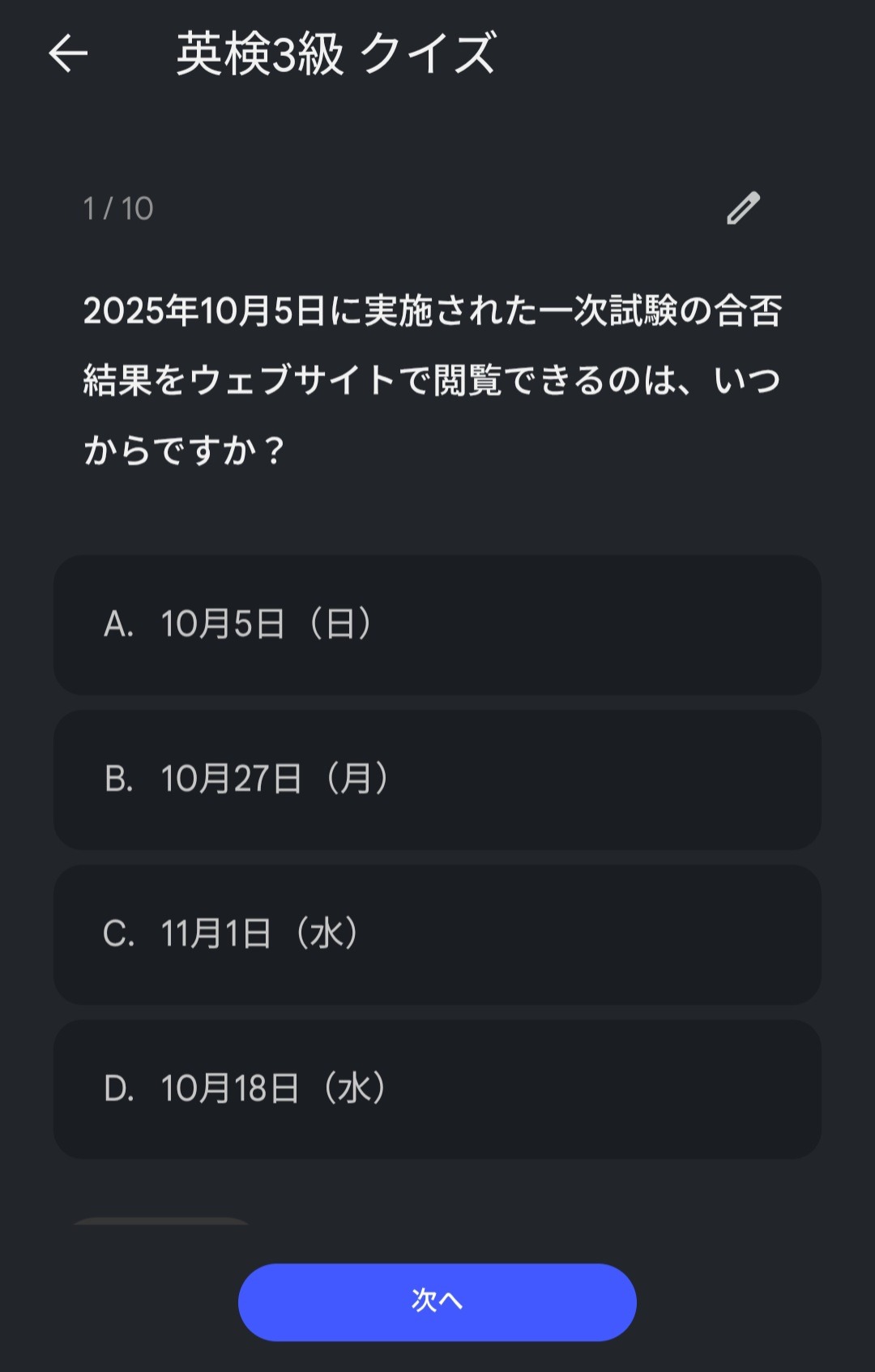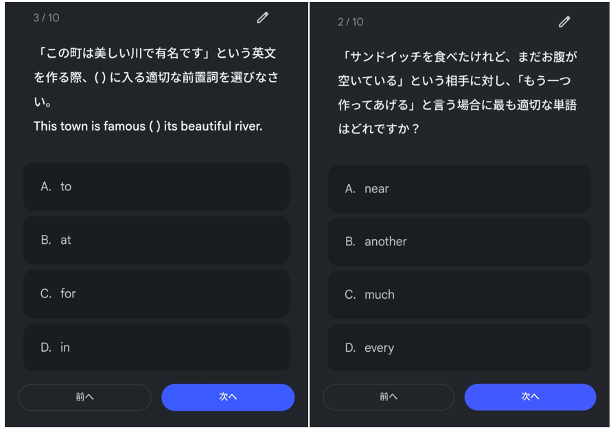 【検証2】英検3級の過去問を読み込ませた「自分専用クイズ」による暗記学習 続いて、学習ツールとしての実力を見るため、