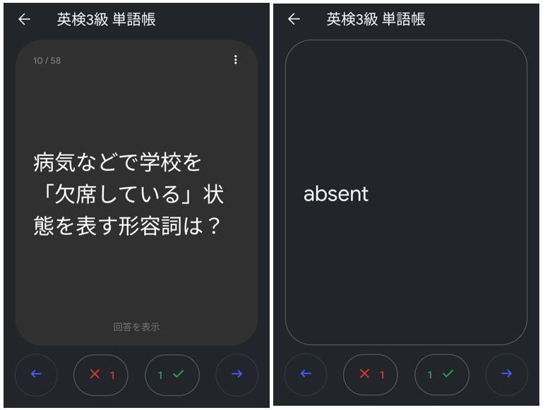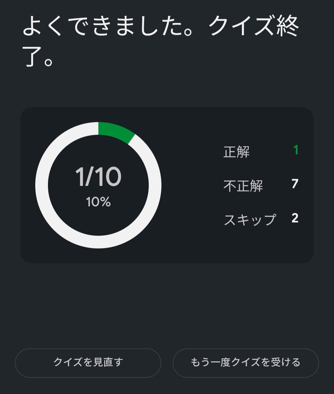 指定の問題数を解き終わると結果も表示されるため、自身の理解度を深めるのに役立ちます。