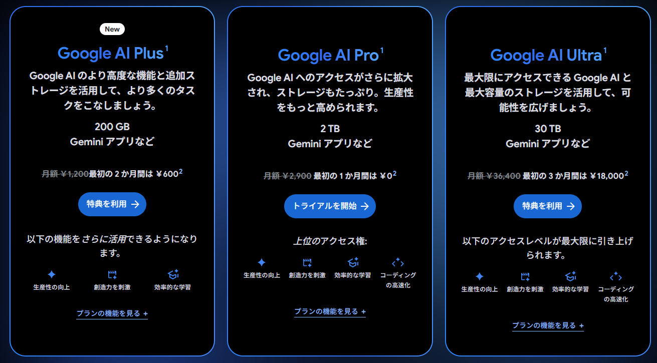 NotebookLMは基本的に無料で利用可能です。 より高度な機能を本格的に活用したい個人ユーザー向けには、Google Oneのサブスクリプションプランである「Google AI Plus」や「Google AI Pro」 等のプランに加入することで、利用上限が緩和されたNotebookLMの機能が利用可能になるほか、最新のAIモデルやクラウドストレージもセットで提供されます。