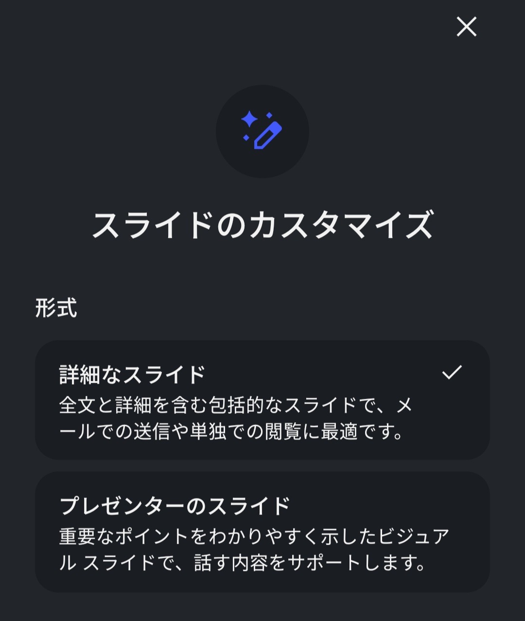 専用アプリならではの利便性 を感じます。 また、スライドの作成についても、スマホでササっとスライドの骨子まで作成することができるので、PCに向かえない休憩中や電車での移動といった隙間時間で骨組みを作成し、家や職場に着いてからPCの大きな画面で細部を仕上げていく という手順で作業を行うことができ、時間の有効活用に貢献できる使用方法だと思います。