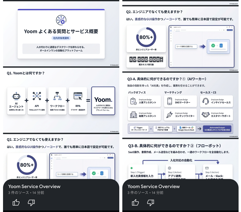✨資料のデータ抽出やスライド作成も、Yoomなら自動化できます NotebookLMのモバイルアプリを活用すれば、外出先でも隙間時間で効率的な資料作成や自己学習を行うことができます。 手元の資料から必要な情報を抽出したり、新しいアウトプットを生み出したりする作業は、今やスマートフォンひとつで完結できるようになりました。 そんな中、Yoomを使用することで、こうした「資料から価値ある情報を引き出す」というプロセスを、個人の作業に留めず、チームや業務全体の仕組みとして自動化していくことが可能となります!