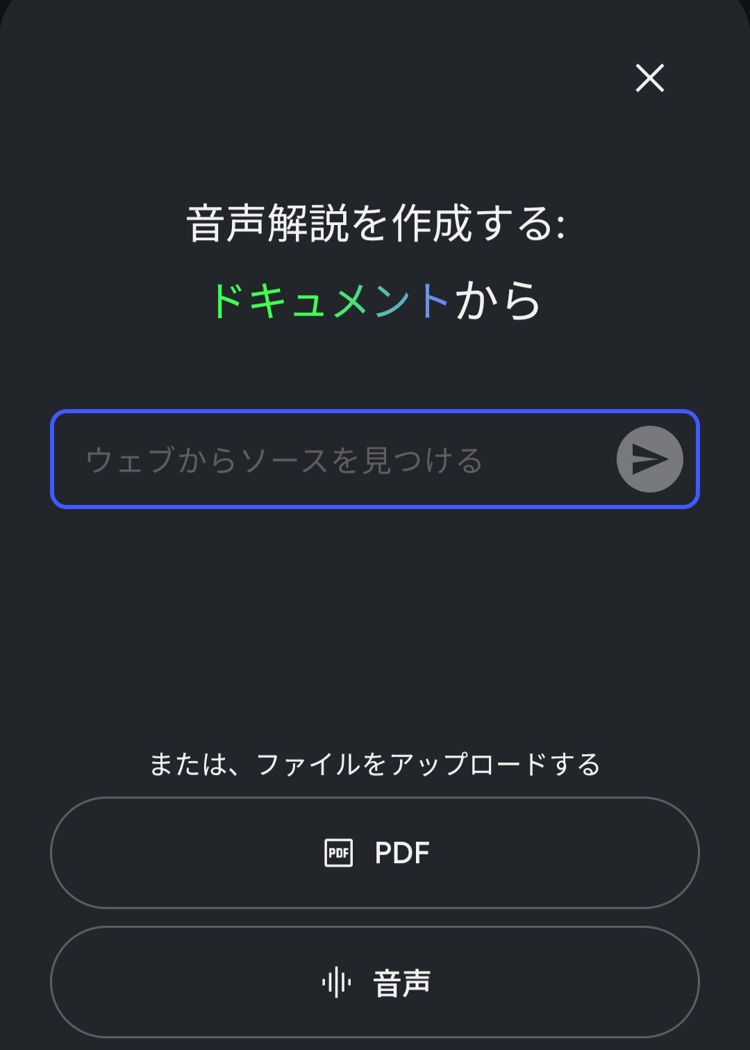 通勤・通学中の電車内や歩行中など、画面を見られない状況でもAIによる対話形式の解説をラジオ感覚で聴き流せる ため、「ながら学習」に最適といえるでしょう。 外出先でサッとPDF資料をアップロードして音声を生成させたり、カメラ機能で紙の資料を撮影してソース化したりと、スマートフォンならではの機動力が存分に活かされています。