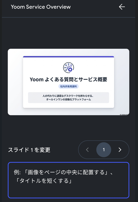 また、スライド1枚ずつチャット形式で修正の依頼もできるため、簡単にスライド資料を作成していくことができました。