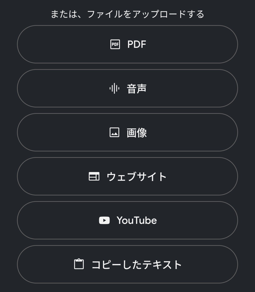 NotebookLMの最大の特徴は、さまざまな形式の資料を「ソース(情報源)」として読み込める点です。モバイルアプリ版でもこの機能は健在で、以下のようなデータをソースとして取り込めます。