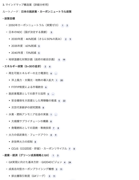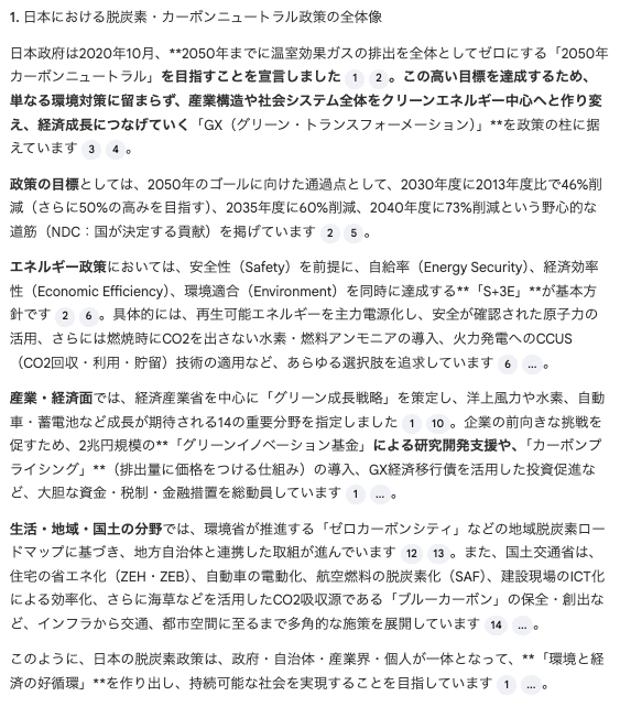 また、広いテーマを「目的→手段→経済→地域→国際」といった自然な流れで分解してくれるため、政策分析やコンサルレポートの骨子としても質の高い内容です。制度名や数値目標など具体的な情報が盛り込まれており、何を調べるべきかが明確になる点も魅力的です。