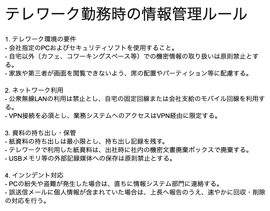 2. 各質問は、実際の業務で起こりそうな具体的なシチュエーションを含めてください。 - 例:「テレワーク中にカフェで作業しても良いですか?」 「個人情報を含む資料を外部にメールで送る際、どんな点に気をつけるべきですか?」 など。