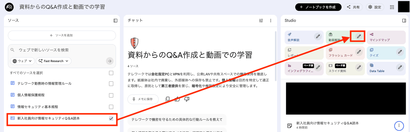 STEP2で作成したQ&Aのソースのみにチェックを入れ、画面右側の「動画解説」をクリックします。