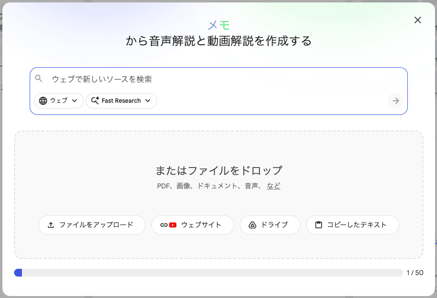 画面左側のパネルから資料をアップロードします。URLでWebページを取り込んだり、Deep Researchで情報を調査したりすることもできます。