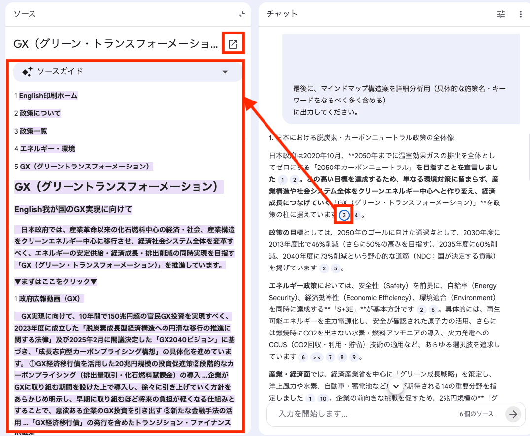 また、その文章がどのWebサイトを参照したのかも確認しやすいです。以下のように、文章の最後にある番号をクリックすると、左側にソースが表示されるようになっています。