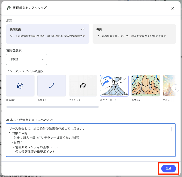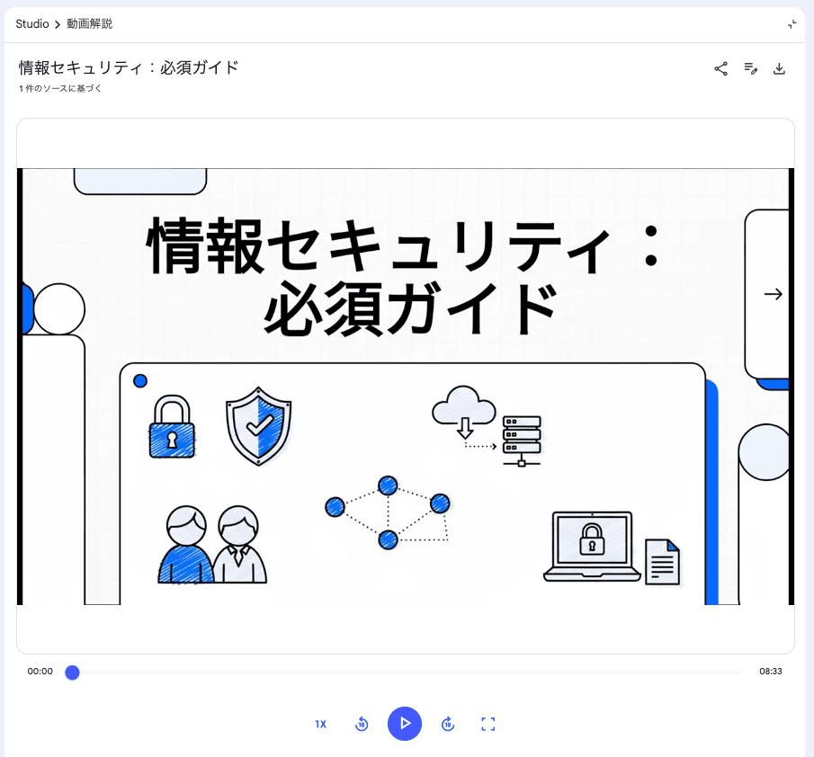 NotebookLMが生成した動画解説は、自然で聞き取りやすい日本語で構成されています。専門用語が多いコンプライアンス分野でも、初心者にもわかりやすく研修にふさわしいトーンで仕上がっていました。