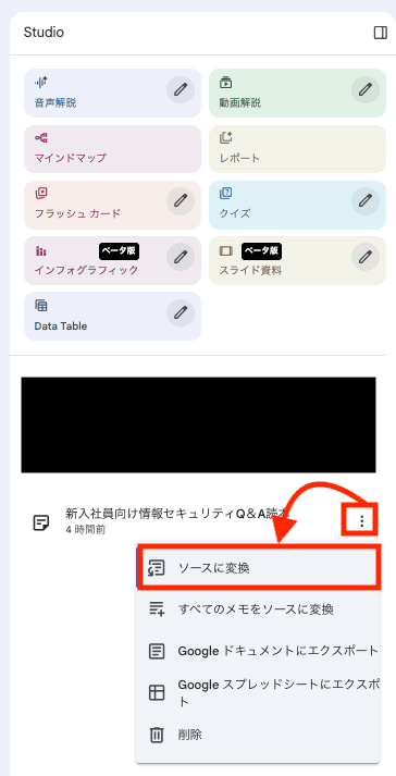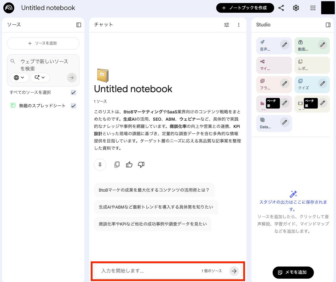 NotebookLMのチャット画面右側にある「Studio(スタジオ)」パネルを使うと、分析結果をさまざまな形式に変換できます。