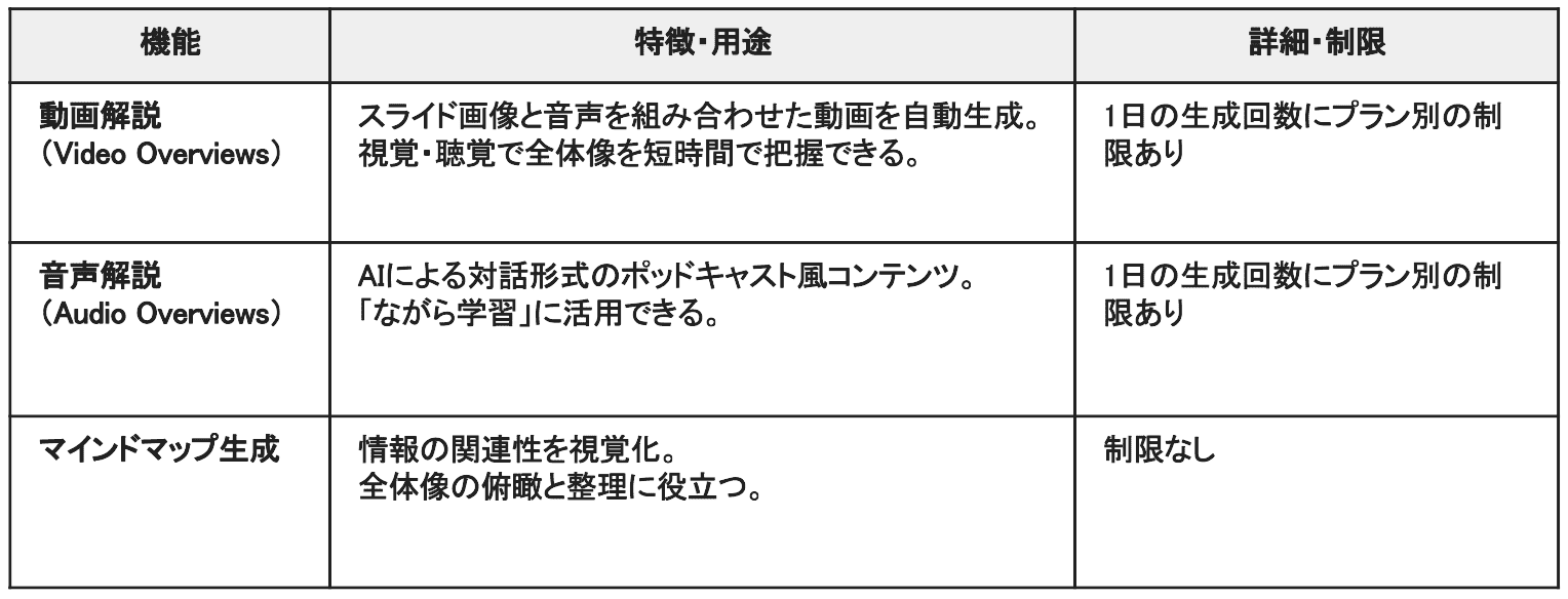 広範なテーマを整理したいとき、NotebookLMはどう構造化すればわかりやすいかを的確に判断してくれる頼れる存在だと感じました!