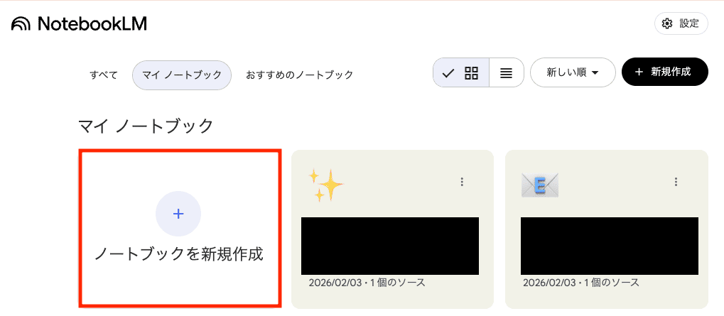 GoogleアカウントでNotebookLMにアクセスし、新しいノートブックを作成します。