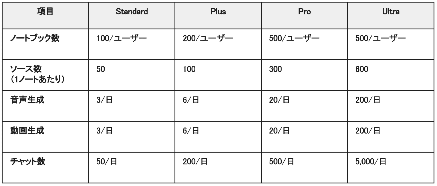 無料プランのほか、制限が緩和された複数の有料プランがあります。1ノートブックあたりのソース数や動画・音声生成の回数上限が異なるため、大量の資料を扱う場合は上位プランへのアップグレードを検討しましょう。