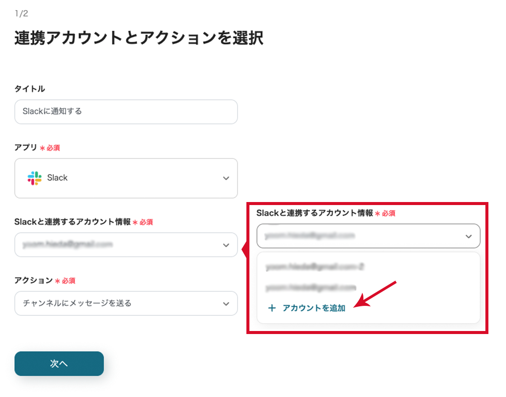 スクロールして下に進むと、「サービス連携」とあります。追加ボタンをクリックし、Webhookを選択。
