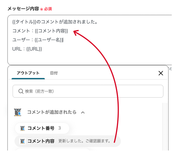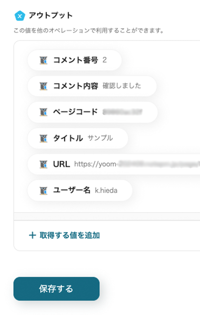 →テストをクリック →成功 アウトプットにはコメントの内容等が抽出されていました。