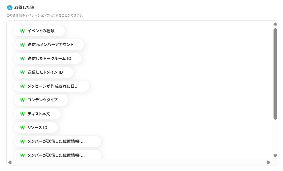 テストが成功した場合は、アウトプット(取得した値) を取得できます。実際の設定では、各項目に具体的な値が反映されます。 こちらの値は次の設定に活用するので、取得された内容を確認して保存しましょう。