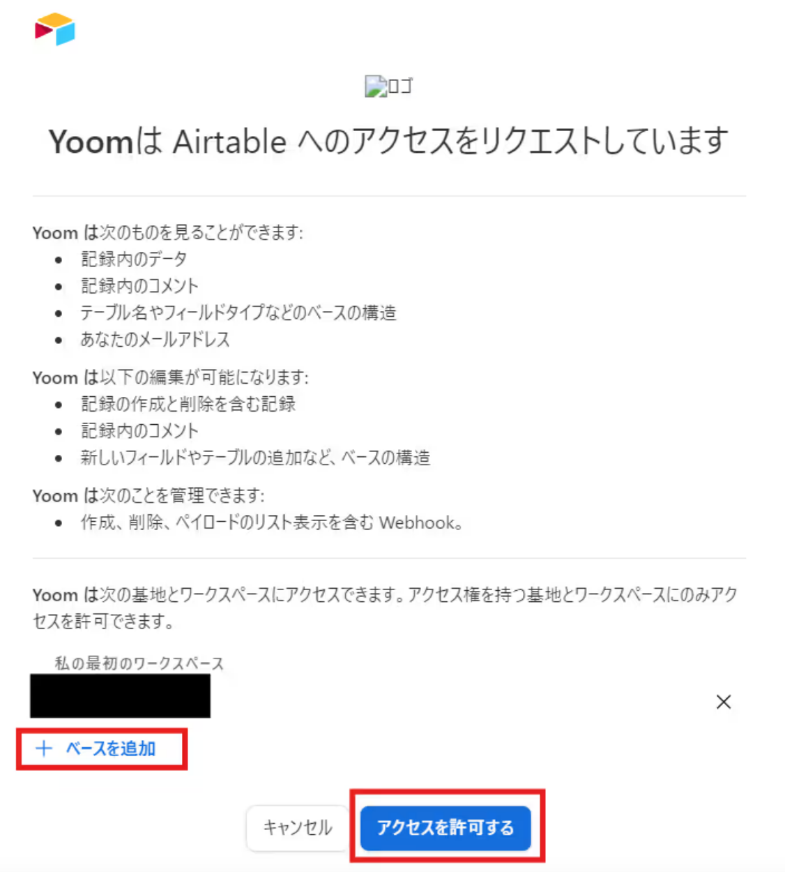 以下の画面が表示されたら、「+ペースを追加」から該当するワークスペースを選択し、「アクセスを許可する」をクリックしてください。