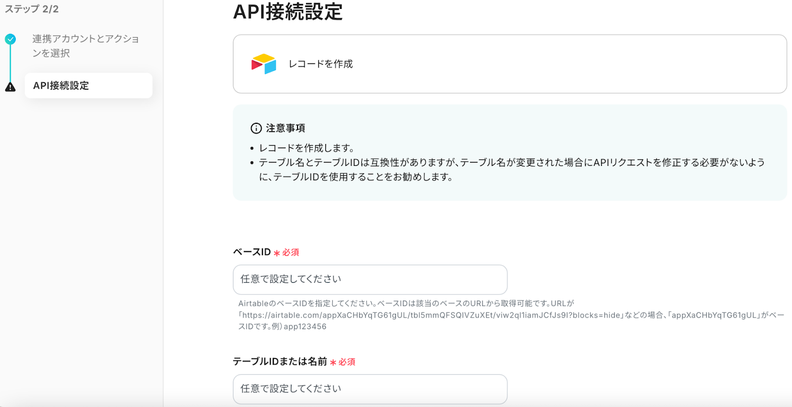 ベースID、テーブルIDを枠外の注釈に従って入力してください。
