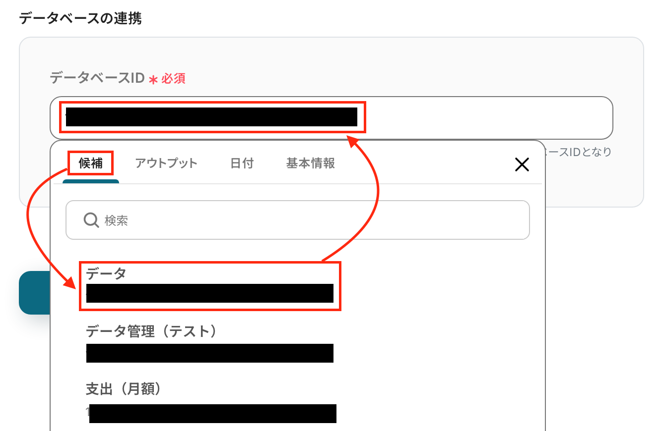データベースIDは、クリックすると以下のように表示される候補から設定しましょう。