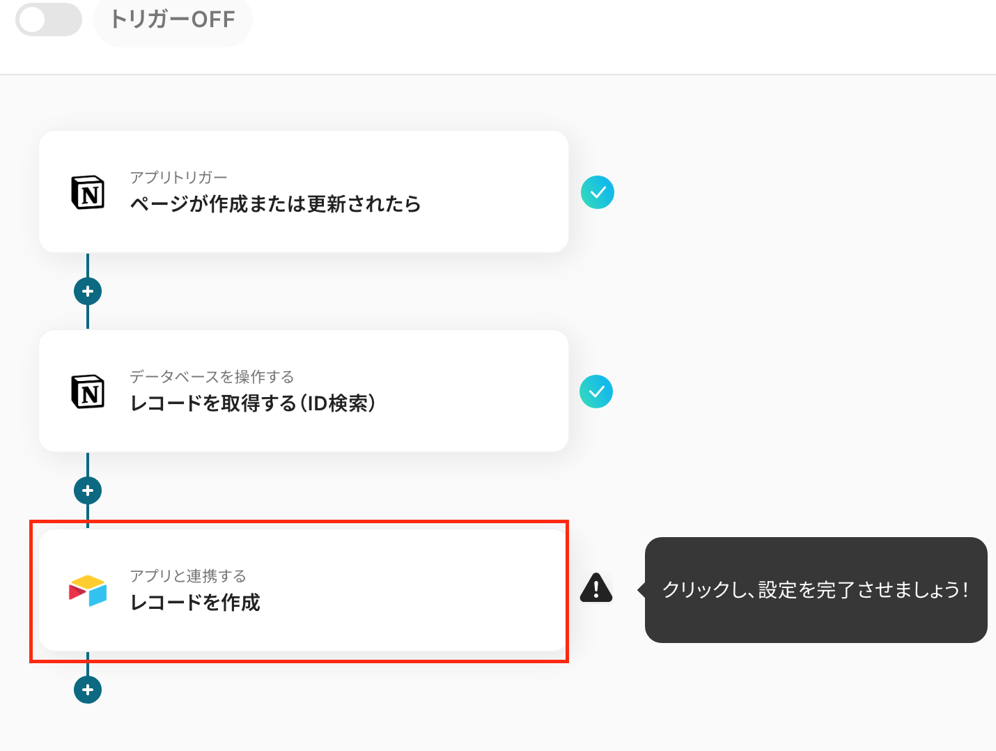 最後にトリガーをONにします。これですべての設定が完了したので、実際にNotionに追加された情報をAirtableにも追加されるか確認してみましょう!