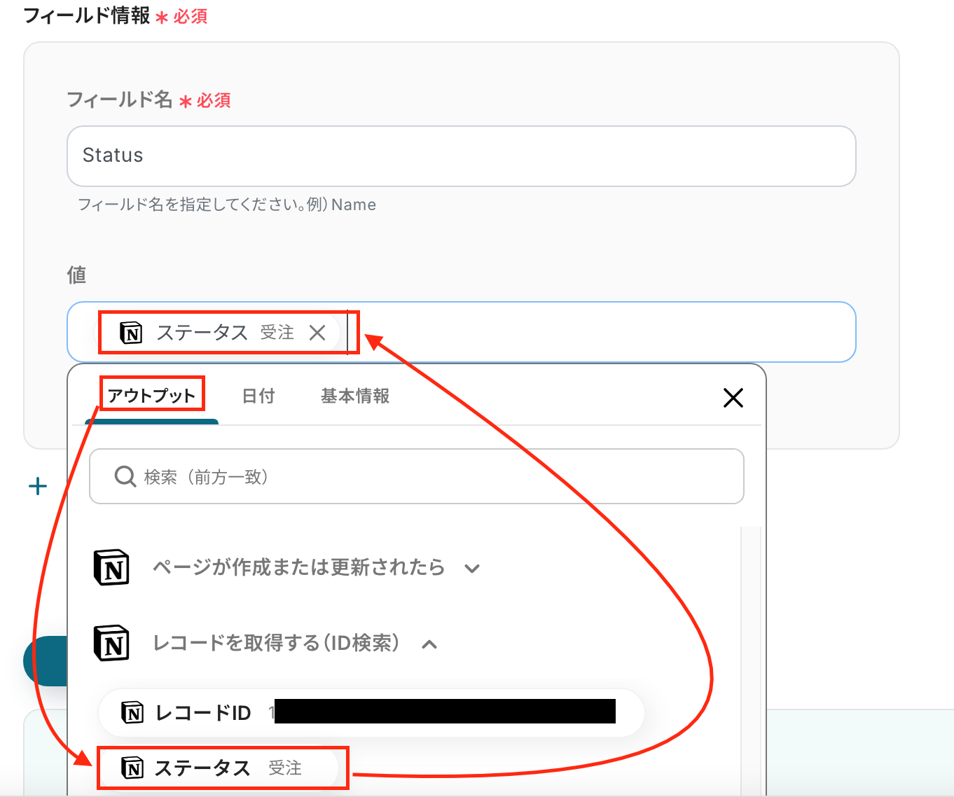 フィールド名は手動入力、値はフィールド名と一致するようにアウトプットから選択します。