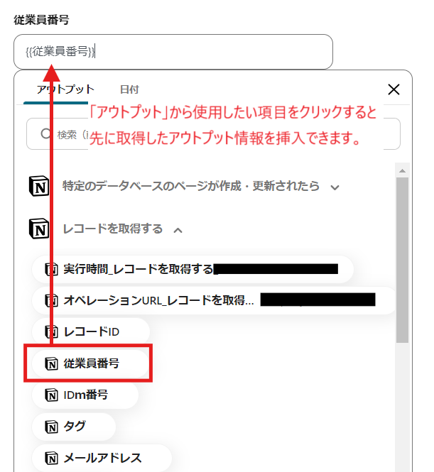 連携済みのNotionのアウトプット情報を活用できるので、アウトプット情報から引用して入力してください。