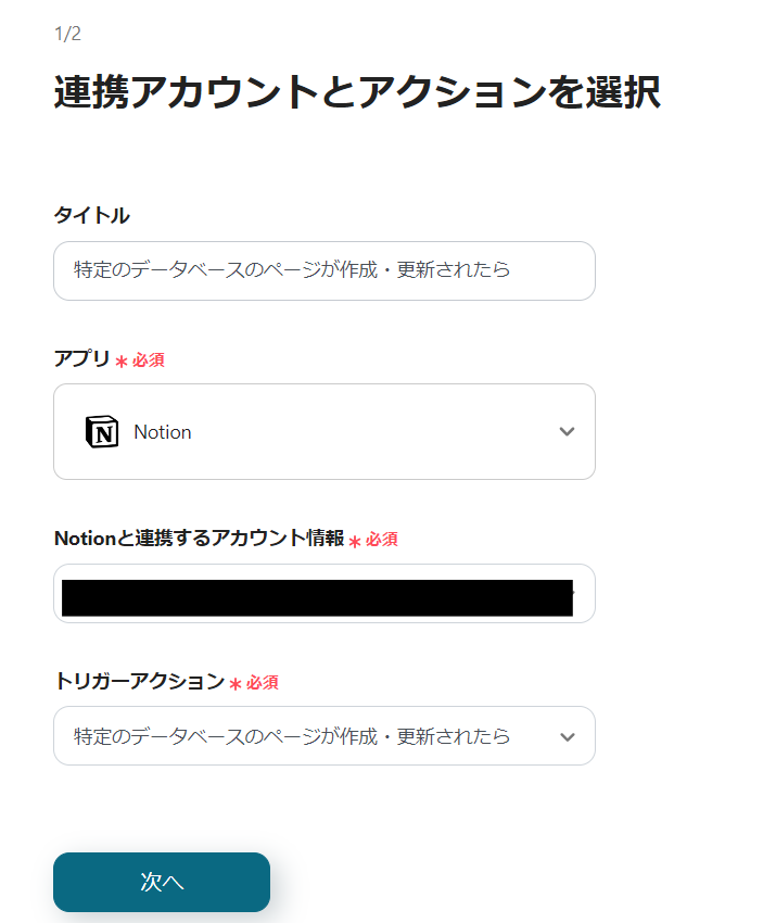 4) アクションは「特定のデータベースのページが作成・更新されたら」を選択して、「次へ」をクリックします。
