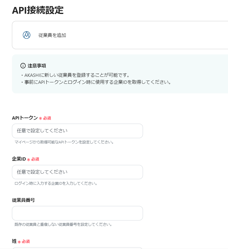 10)アクションは「従業員を追加」を選択して、必須項目を入力します。