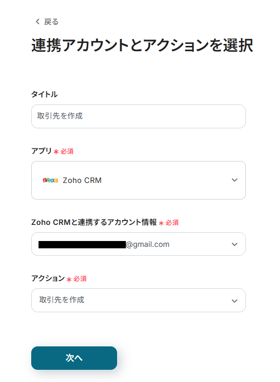 Zoho CRMのトリガーを「新しく取引先が作成されたら」に設定して、同様にフローを作成していきます。