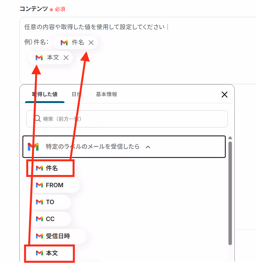 このように取得した値を活用することで最新のデータをその都度Notionへ自動連携可能となります。なお、テキストを直接入力した部分は固定値とされるため、毎回変動することが望ましい「件名」や「本文」などは取得した値を活用し、定型文にしたい部分は手入力しましょう。