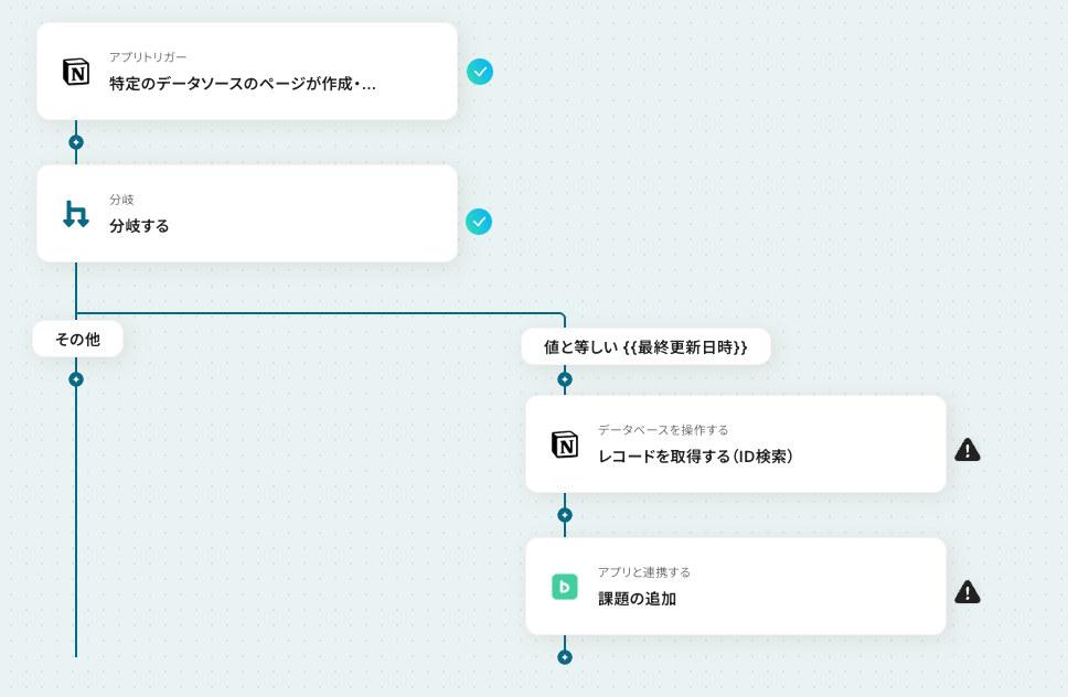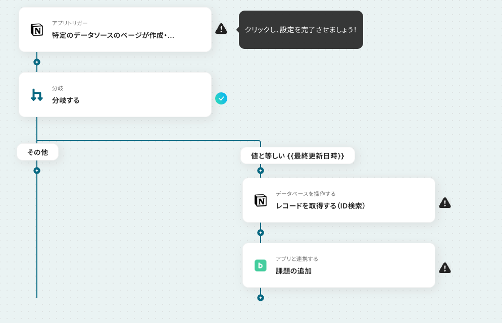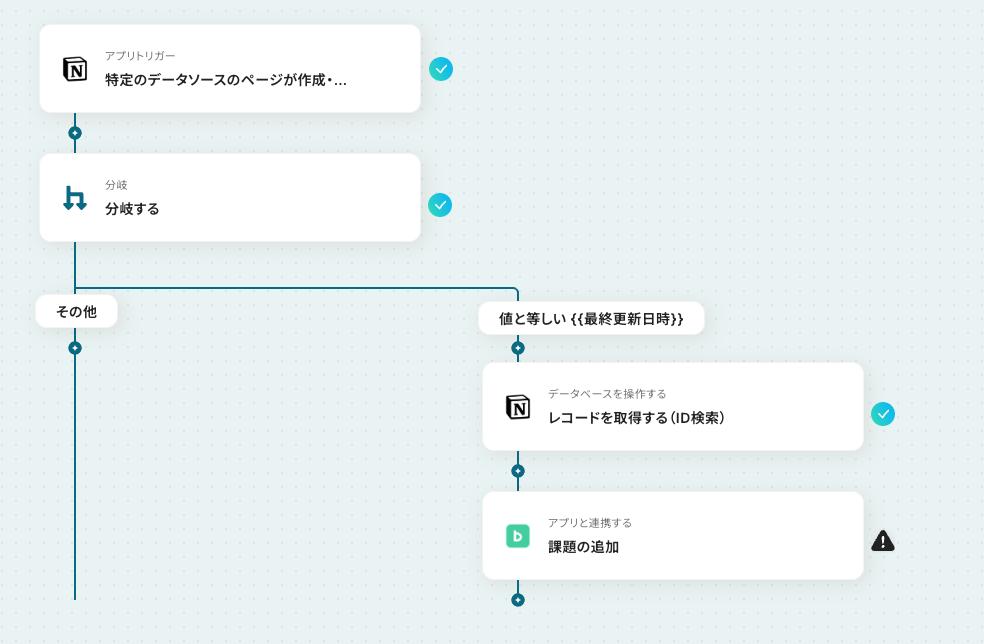 フロー設定 今回は【Notionの情報を更新したら、Backlogにタスクを作成する 】というフローを作成していきます。