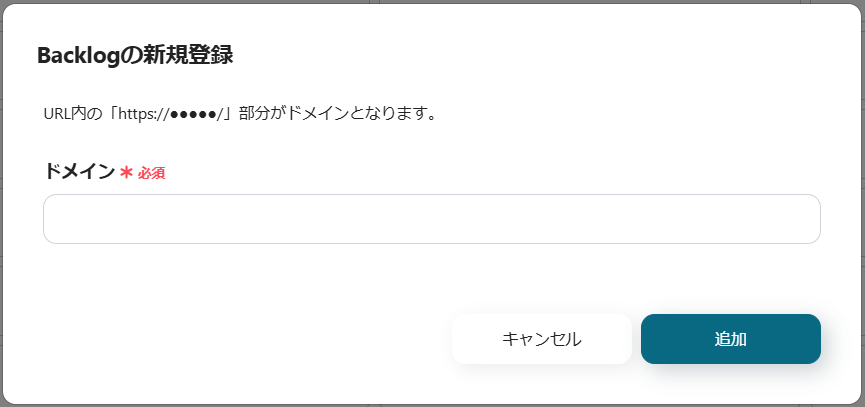 14.「ドメイン」はBacklogのURL内の「https://●●●●●/」部分がドメインとなります。 「課題を登録するプロジェクトID」はアプリ登録されているとドメイン名入力後、候補から選択することもできます。