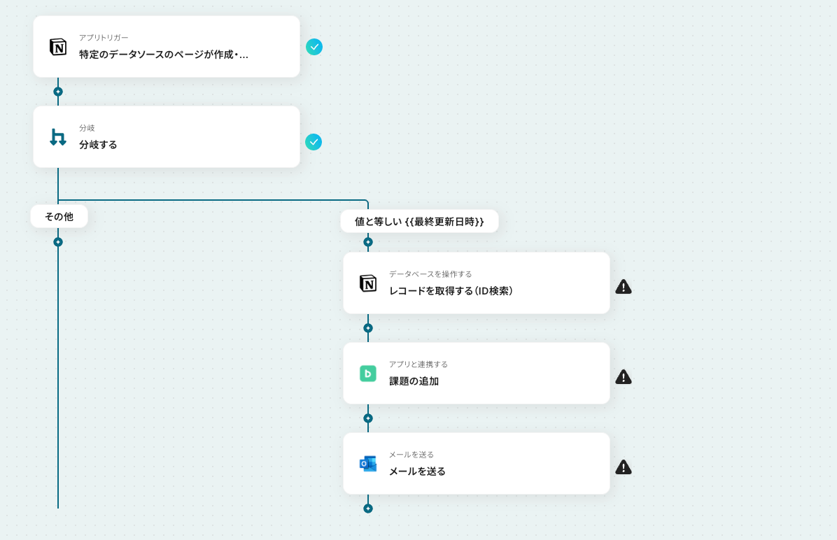 しかし、Notionに追加されたデータを自動的にBacklogに課題として追加し、Outlookでメールを送付することでその課題を解決できるでしょう。