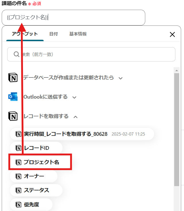 「レコードを取得する(ID検索)」のアウトプットから選択しましょう。