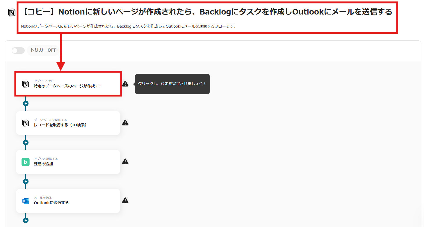 ステップ4:トリガーボタンをONにして、Notion・Backlog・Outlookの連携動作を確認