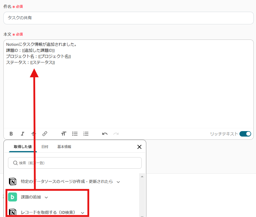 - Backlogに登録する課題の件名や詳細には、Notionから取得したページの情報(変数)を埋め込んだり、固定のテキストを追加したりと柔軟に設定できます