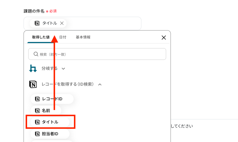 続いて、Notionのレコードを取得する設定を行うため、「レコードを取得する(ID検索)」をクリックしてください。