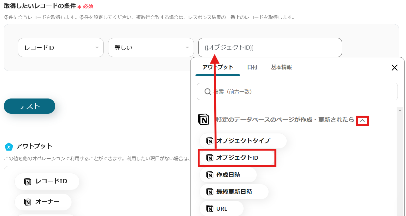 「特定のデータベースのページが作成・更新されたら」のアウトプットを活用し、以下のように設定しましょう。