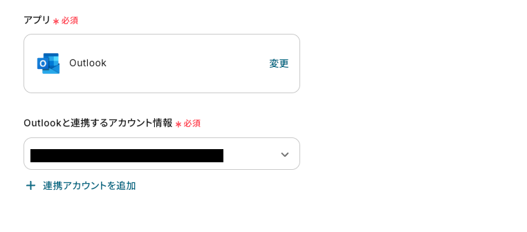- Outlookのトリガー設定では、処理対象としたいメールのキーワードや監視対象のフォルダを指定できます。