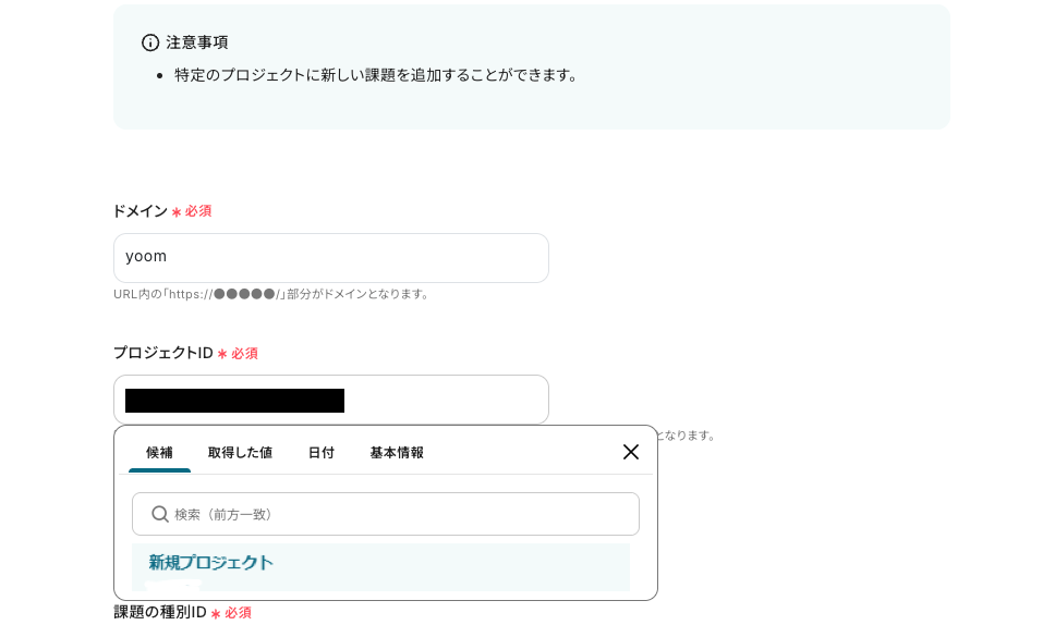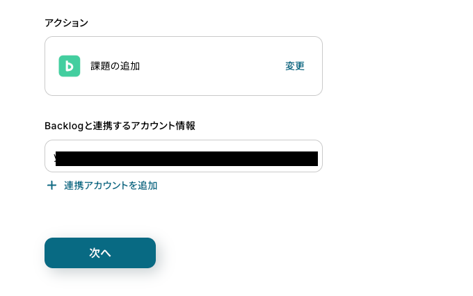 - 次に、オペレーションでBacklogの「課題の追加」を設定し、取得した情報をもとに課題を作成します