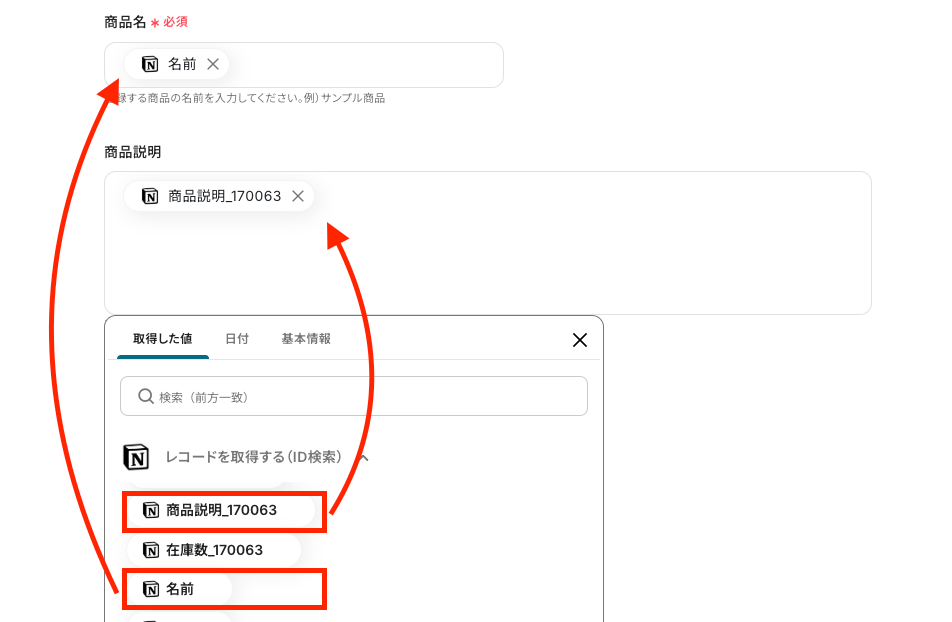 - 最後に、オペレーションでBASEの「商品情報の登録」アクションを設定し、Notionから取得した情報をマッピングして商品を登録します