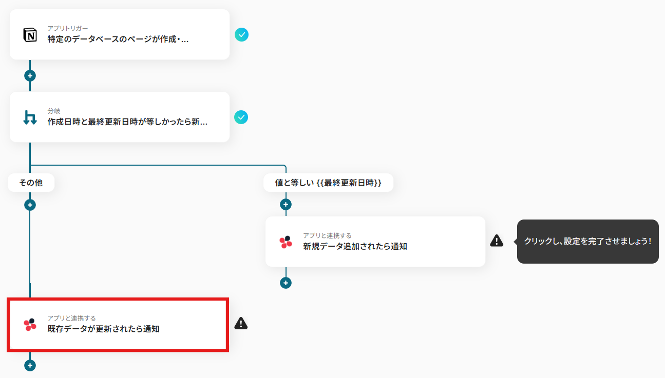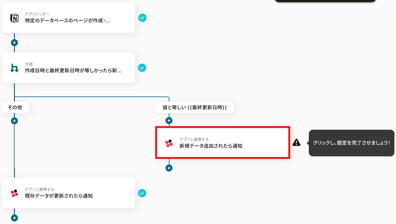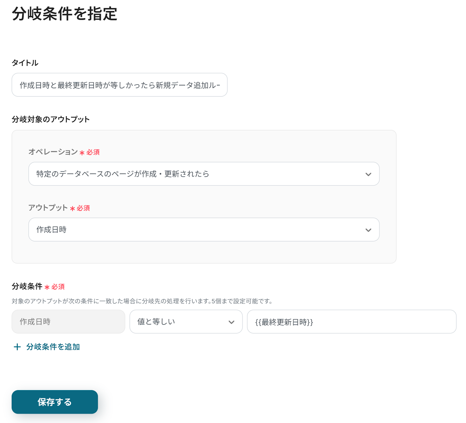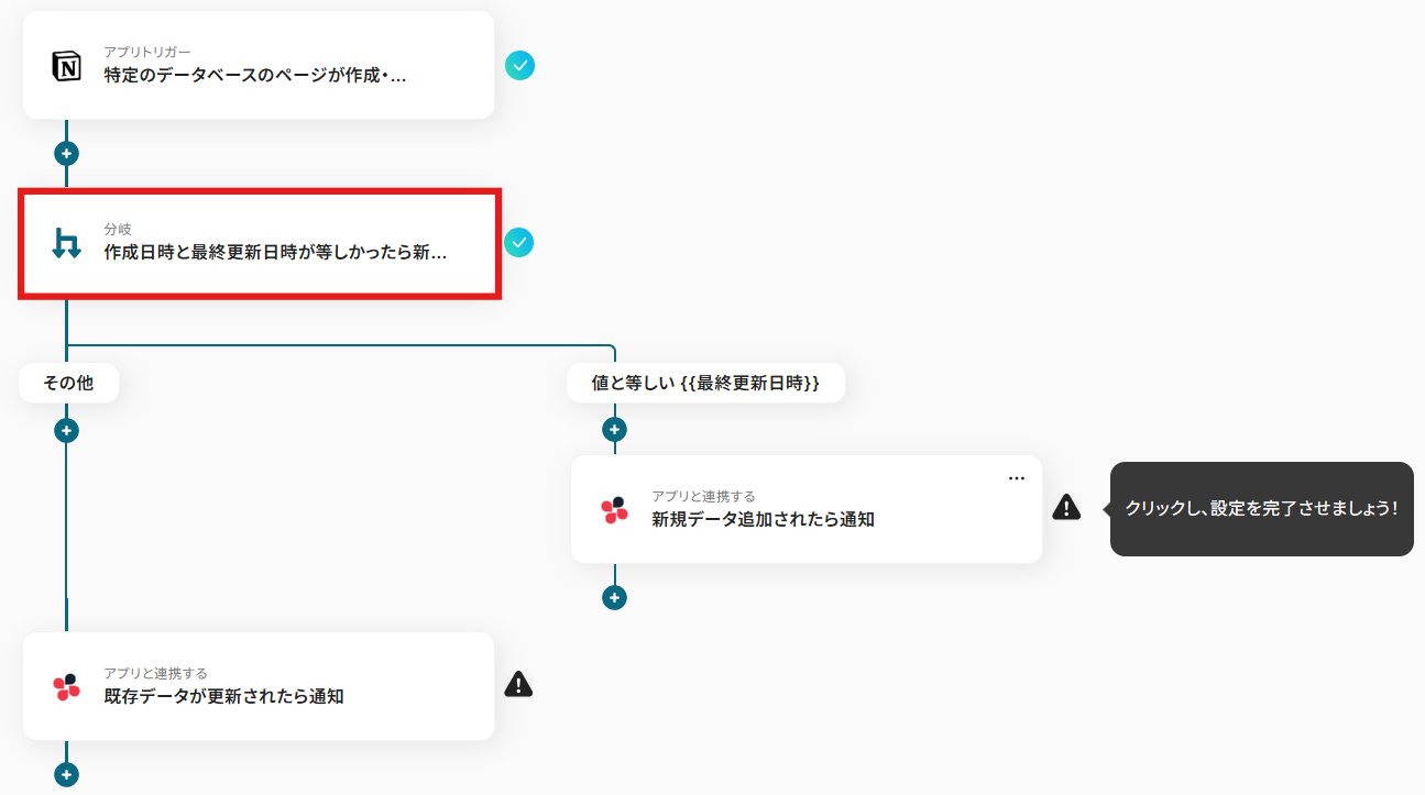 続いて、分岐する設定を行うため、「作成日時と最終更新日時が等しかったら新規データ追加ルートに分岐する」をクリックします。